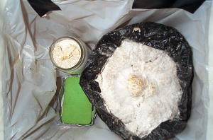 5月4日 エリンギの小さな芽が沢山出ているが連日の暑さで菌が弱ったのか アオカビが発生し腐ってしまった。 |