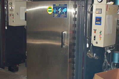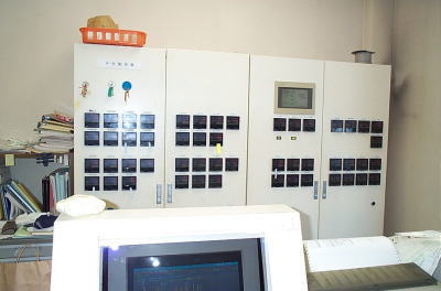 ここでキノコ栽培室の温度や湿度を管理します。 手前のモニタに現在の状況が表示されいつでも見られます。 |