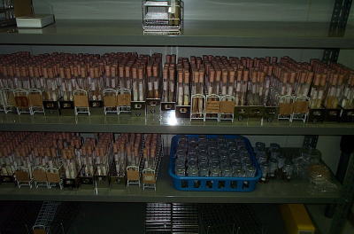 種菌の保存室です。様々な種類の菌が保存されており、採取した野生のキノコの菌も保存しています。 |