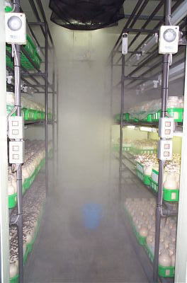 栽培室の様子。白くもやがかかっているのは霧発生装置から出る水蒸気です。これで湿度を保っています。キノコによって温度は違うそうですが肌寒い感じがしました。