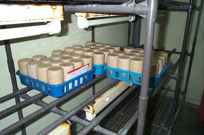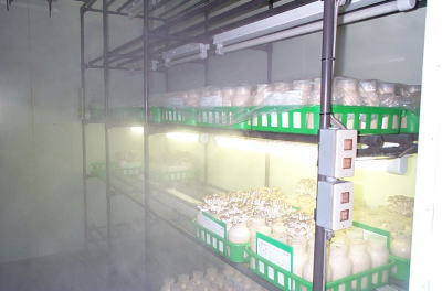 光が成長に関係していて、栽培室の棚に蛍光灯が設置されています。