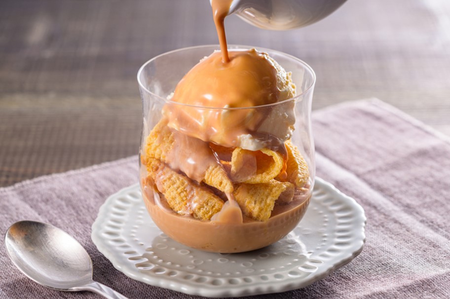香り豊かなシナモンとやさしい甘さのロイヤルミルクティー味のとんがりコーンを組み合わせて、チャイ味をイメージしました。お好みで一口大に切った冷凍の大学いもをトッピングすると、ひんやりとしておいしく、食べごたえのある一品に仕上がります。作る時間も食べる時間もワクワクしていただけたら嬉しいです。