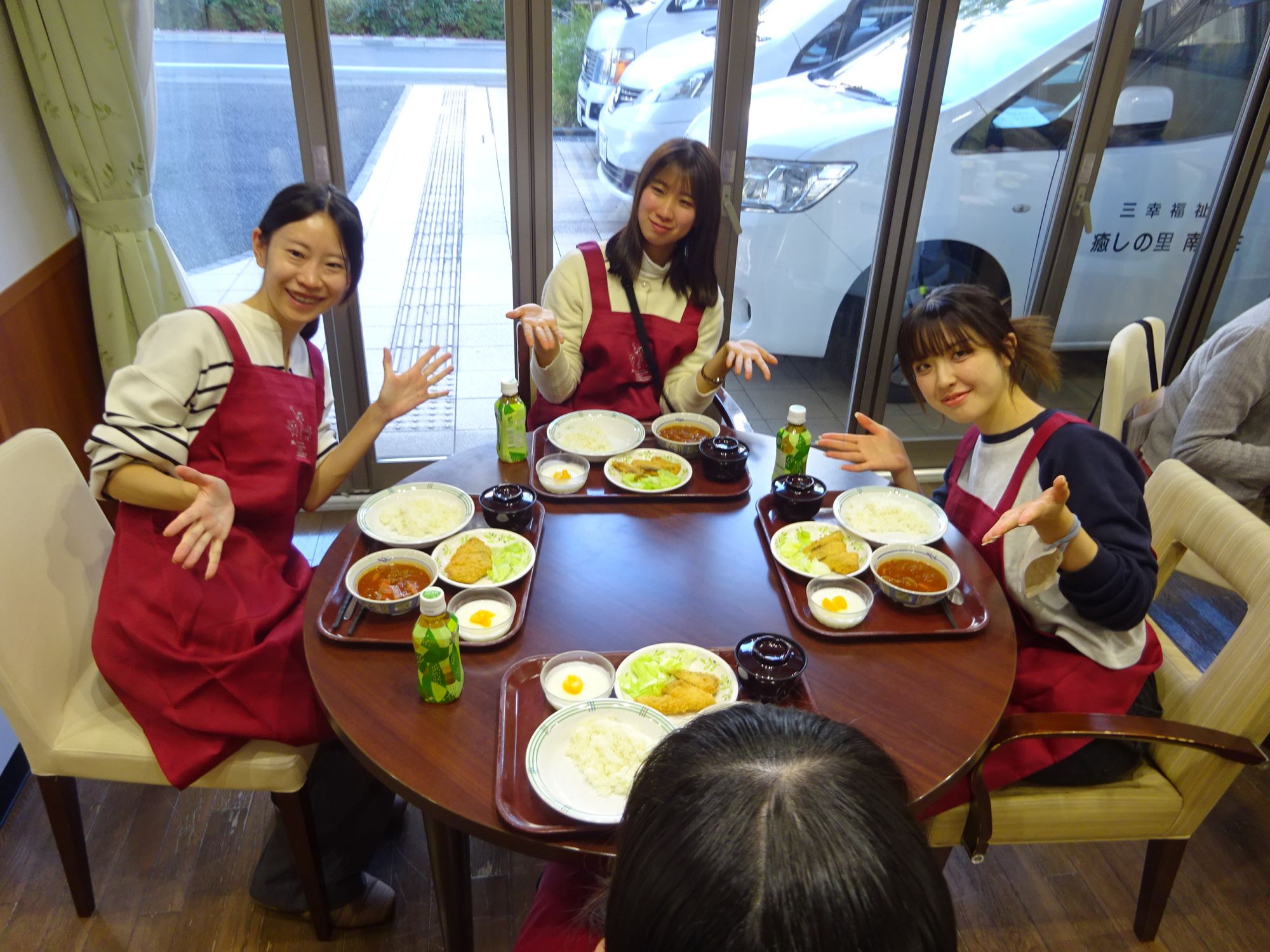 2025年11月22日(土)、荒川区の特別養護老人ホーム癒しの里 南千住が運営する「いやし食堂」において、本学短期大学部 食物栄養学科 小澤啓子准教授のゼミに所属する2年生4名が、学修の一環として あらかわ満点メニューの提供 と 栄養講話 を行いました。