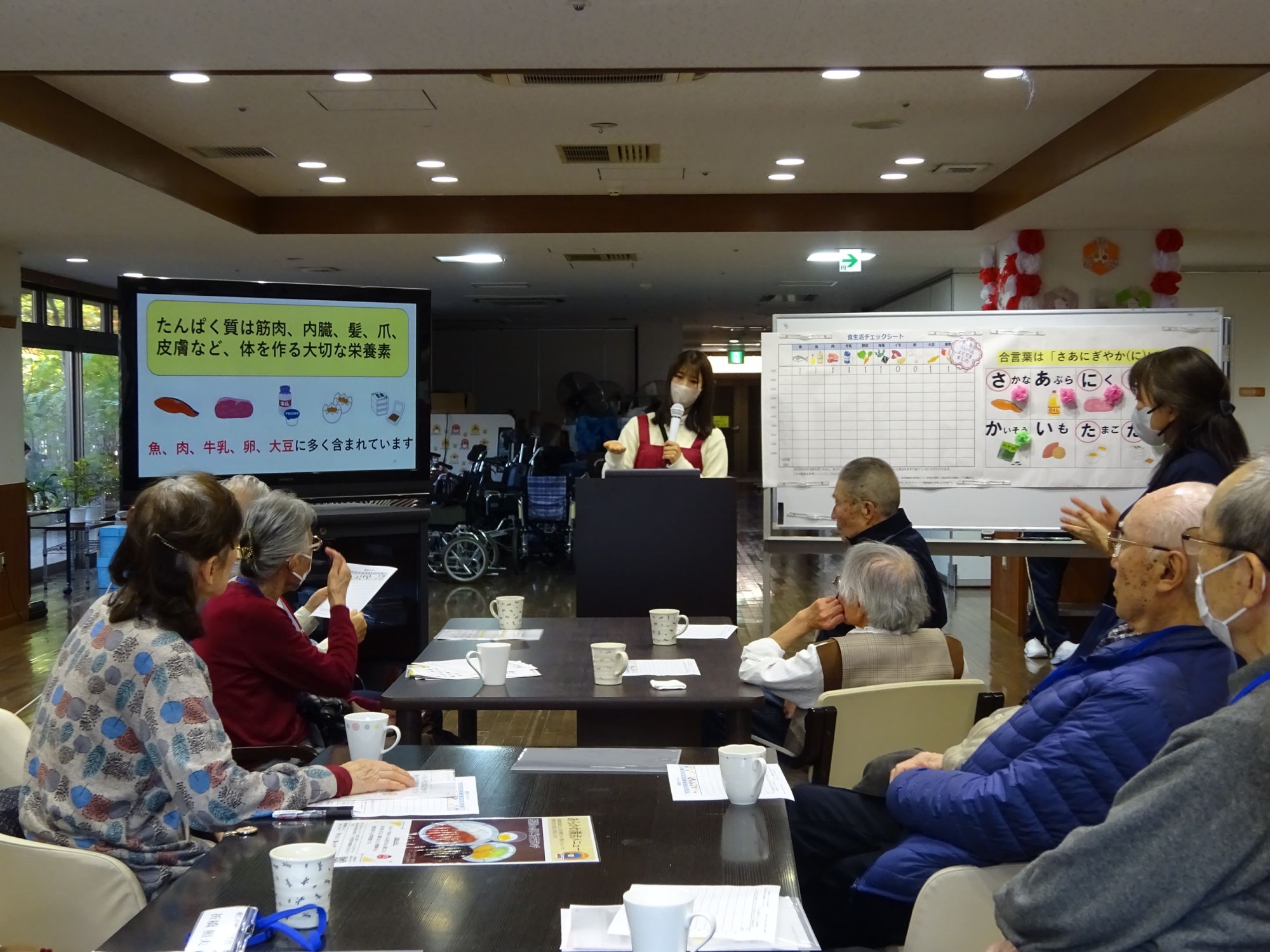 食前・食後には、担当学生が中心となり、「毎日を元気に過ごすための食事の工夫」として、「さあにぎやかにいただく」10食品群を活用した食事の整え方について、わかりやすく講話を行いました。長期保存食品の活用、間食の賢い取り入れ方、1日3食の重要性 といった、日々の食事にすぐ役立つポイントを紹介しながら講話を展開しました。