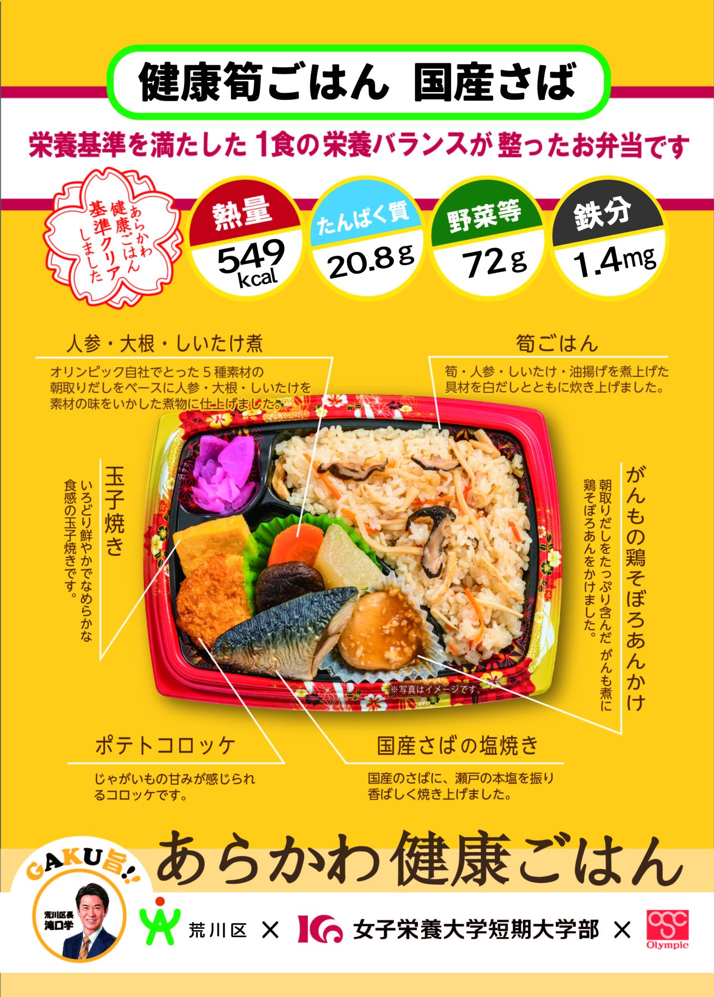 販売場所 : 荒川区内Olympic4店舗を含む約70店舗(1都3県に立地) 販売弁当 : 健康筍ごはん 国産さば(税込591円) ・ 健康舞茸ごはん 豆腐ハンバーグ(税込483円)