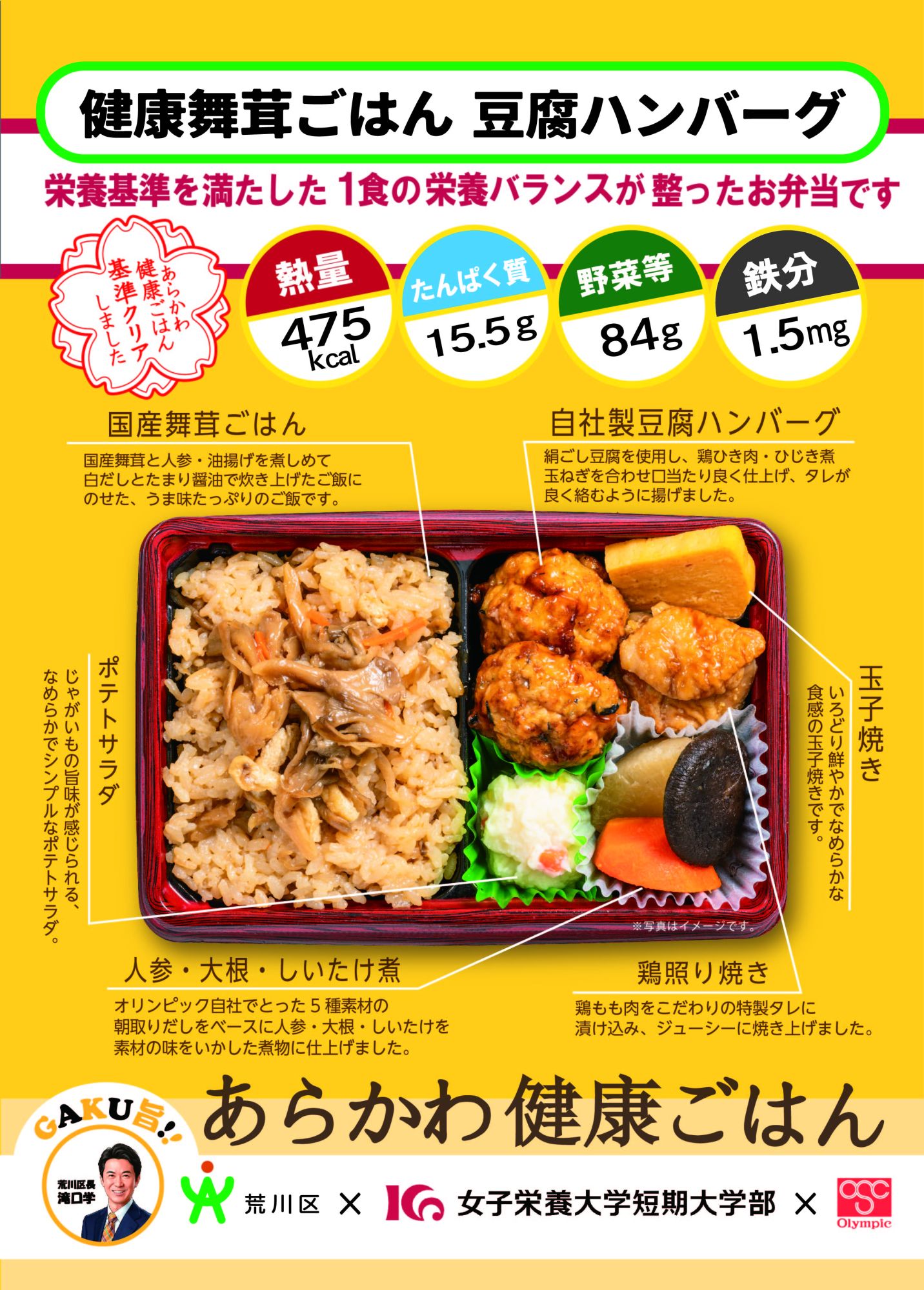 荒川区「あらかわ満点メニュー」事業の一環で本学 短期大学部 ・荒川区・株式会社Olympicと三者共同で「あらかわ健康ごはん」(弁当)を開発