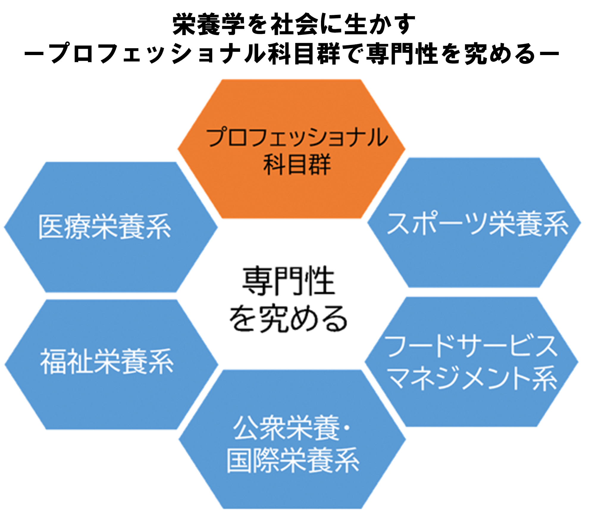将来を見据え、自分らしい専門性を見つけ究めていけるよう、管理栄養士の社会的ニーズとともに本学の卒業生としての管理栄養士が活躍する職務を考慮し、「プロフェッショナル科目群」を設けています。分野ごとに講義と実習を配置し、それぞれの専門を深く学習できる構成に工夫しています。学生は、自分にあった分野を自由に選ぶことができます。令和7年度からはその内容の充実を図ります。
