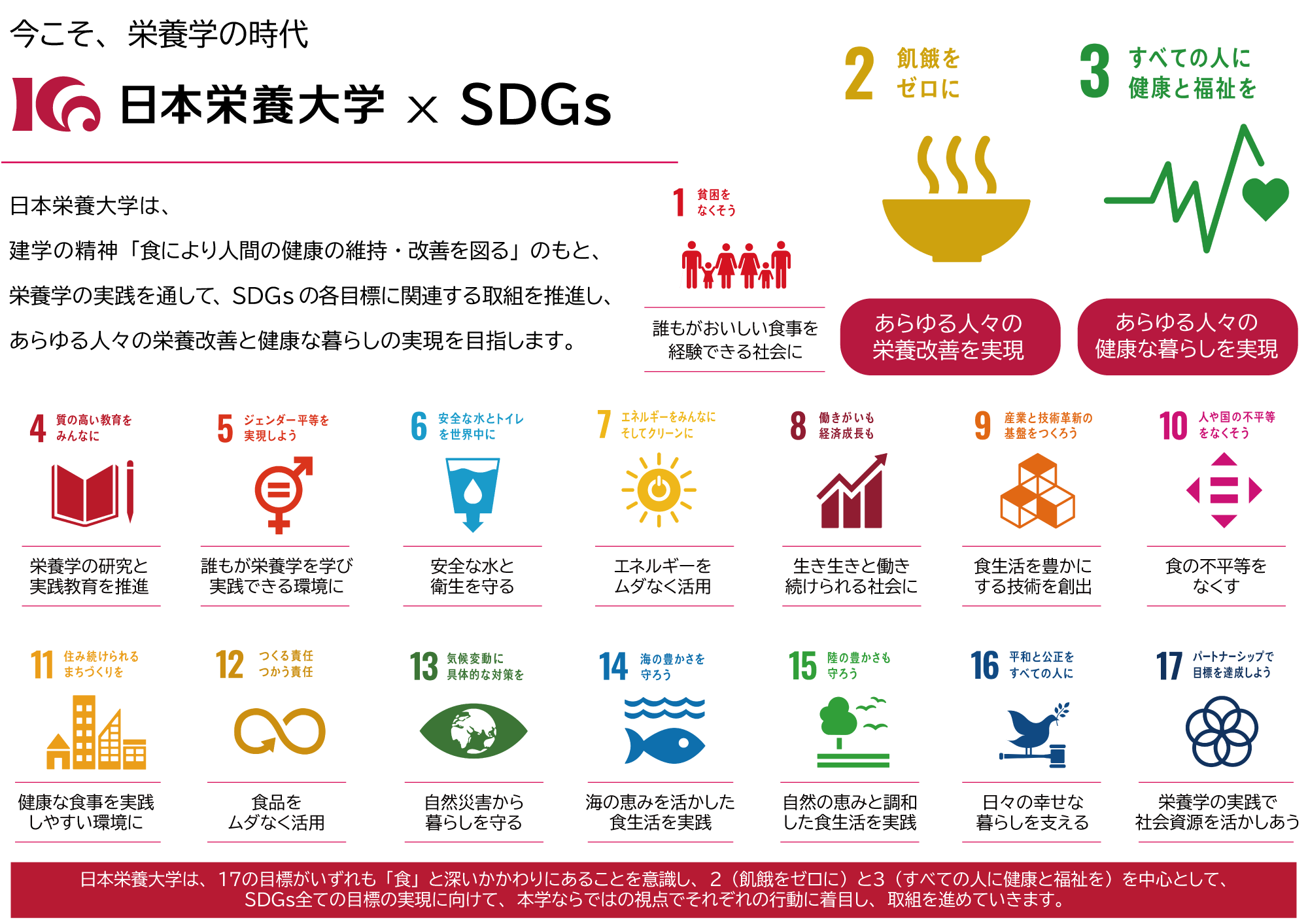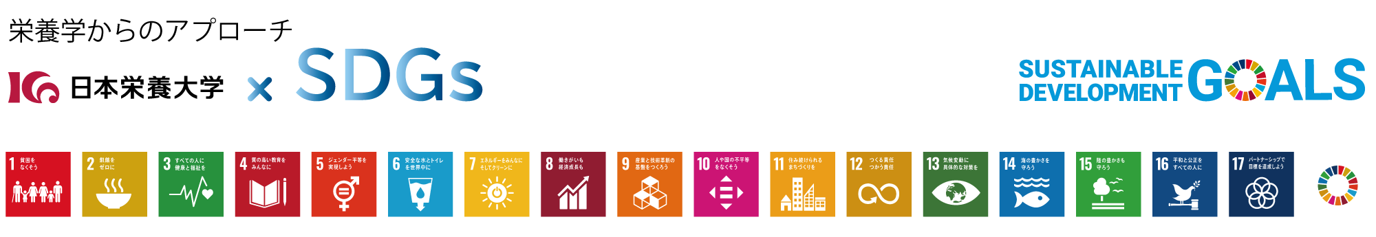 日本栄養大学は、建学の精神「食により人間の健康の維持・改善を図る」のもと、 栄養学の実践を通して、SDGsの各目標に関連する取組を進めていきます。
