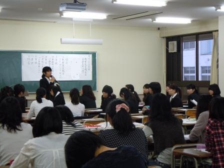 下の写真は、教育実習で使用した教材等を3年生に説明しているところですが、