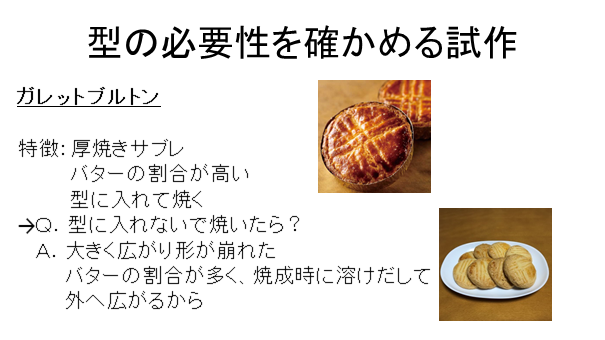 事前アンケートでは、作ったことのあるお菓子や失敗例、今後作ってみたいお菓子などを聞きます。それに基づき、お菓子教室で何をするか決めていきます。そのために、様々なクッキーやパウンドケーキ、マドレーヌなどの焼き菓子を試作し、レシピを分かりやすくポイントなども加え、作りました。材料、器具、混ぜ方、温度、時間の違いや代用品で作った場合、どのように差が出るのかなどを、書籍やWebサイトを調べながら進めています。