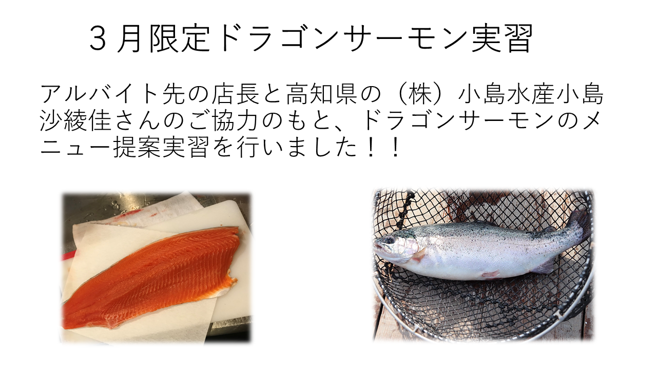 私は居酒屋でアルバイトする中でお酒とお料理を通して様々なお客様とのコミュニケーションが広がることを学んだ。アルバイト先のお店のコンセプトである高知県の地方創生のお手伝いをすると共に、高知県の食材でメニュー提案をしようと考えた。また、生産者から得た情報をお客様に、お客様の評価を生産者に。と橋渡しの役割も果たそうと思った。なぜなら、生産者がお客様の評価を聞ける機会はなかなか少ないからだ。今回の実習では株式会社小島水産の小島沙綾佳さんとアルバイト先の店長に協力してもらい、ドラゴンサーモンという3月限定で出荷される養殖サーモンで行った。癖がなく脂っこくないドラゴンサーモンは色々な料理に合わせやすいものだった。しかし、作り手の店長の手間や原価30%前後でのメニュー提案はとても簡単なものではなかった。店舗でも自宅でも試作を行い、やっと販売までにたどり着いた。お客様からの美味しいという声が何よりも嬉しく、頑張ってよかったと感じた。この嬉しい気持ちを生産者の方にも伝え、また生産者の方からの喜びの声の声を聞き、嬉しくなる。嬉しいの連鎖がお客様と生産者にとってwin-winであると気づくことができた。