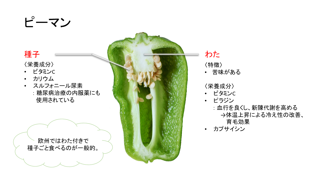 野菜を使って料理をする際、その一部を捨てることがある。例えば皮をむく、種やわたを取り除くなどだ。そうするのはそれらが腐っているからではなく不可食部位だと認識しているからではないだろうか。しかしそうして廃棄している部位でも食べられる部位はあり、現に日本ではあまり定着していないだけで海外では当たり前に食べている部位もある。私は食べられるにも関わらず捨ててしまうのは非常にもったいないと感じ、この研究を行うことにした。 本研究の目的は廃棄している部位であっても不可食部位とは限らないということを周知し、自然からの恵みを最大限に活用してもらうこと、ひいては食品ロスや廃棄物を減少させることである。