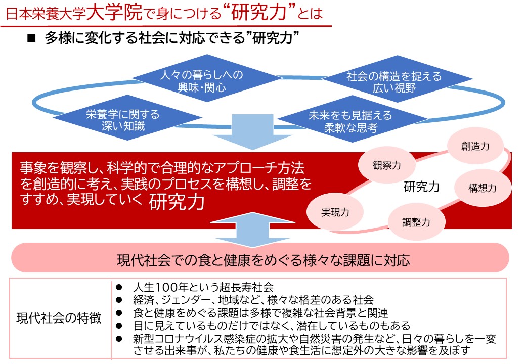 人間や食物の多様性を尊重する姿勢を保ちつつ、栄養学分野における高度な研究力に加え、学際的な能力と質の高い実践力を持つ人材を養成します。
