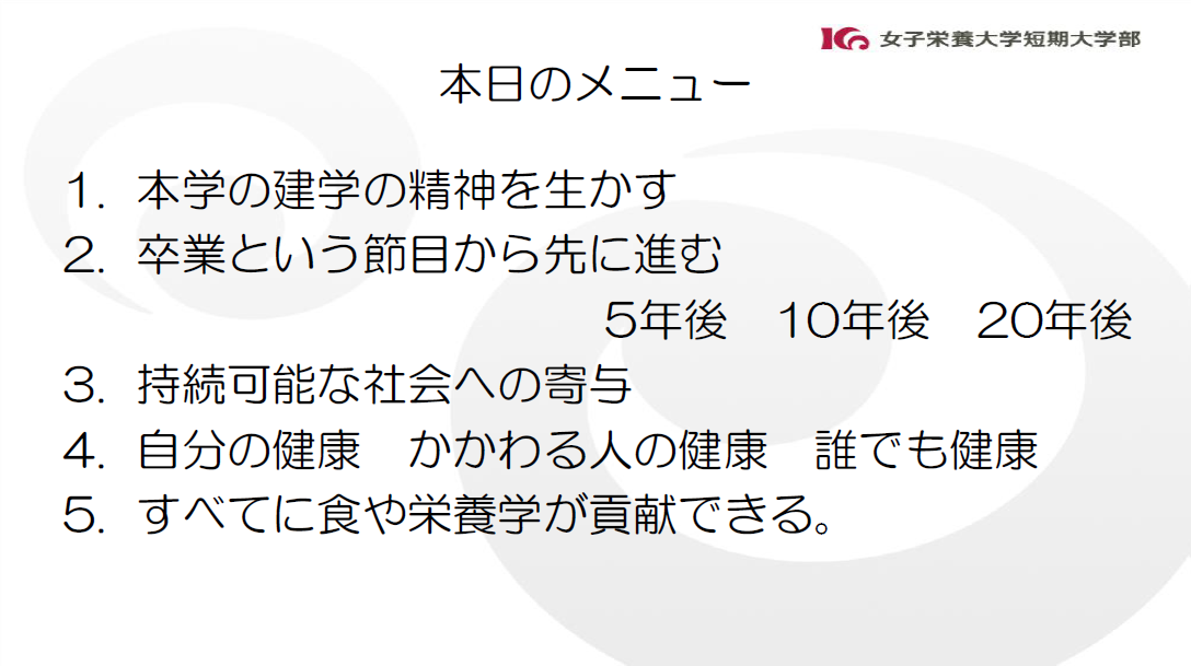 ■講義内容は、前半は、本学の学問的ルーツから始まり、建学の精神について、本学の歴史も交えながらのお話。後半は、実践栄養学が大切な理由、これからの社会で実践栄養学が果たしていく役割について、学びます。