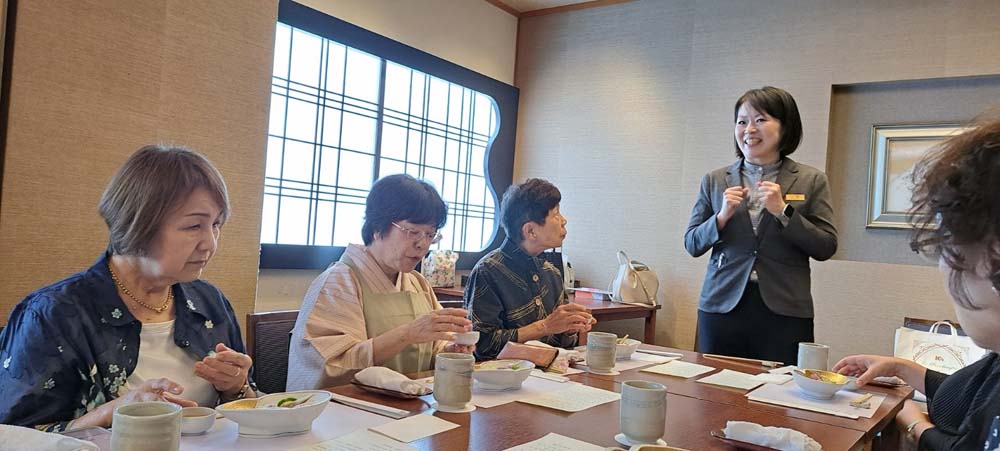 研修会は「会席料理のマナーを知り、おいしくいただく!」をテーマに、パレスホテル大宮の片柳氏より、割り箸の袋の始末、箸の割り方、持ち上げ方や、器の持ち方、椀物のふたの開け方など、細かく教えていただきました。基本は楽しくいただく、というところですが、正しい所作を知り実践することで、食べる姿も美しくより味わい深く食べることができます。器、盛り付けも素晴らしく、味付けも美味しいお料理を食べながら、楽しく学ぶことができました。