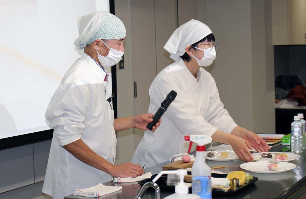 講座では、「あんが乾く前に仕上げる」「乾燥防止のため水飴を加える」「つなぎに白玉粉を使うため、手や作業台を濡らしながら作業する」「濡れ布巾は固く絞らない」など、実践的なコツも次々と紹介されました。