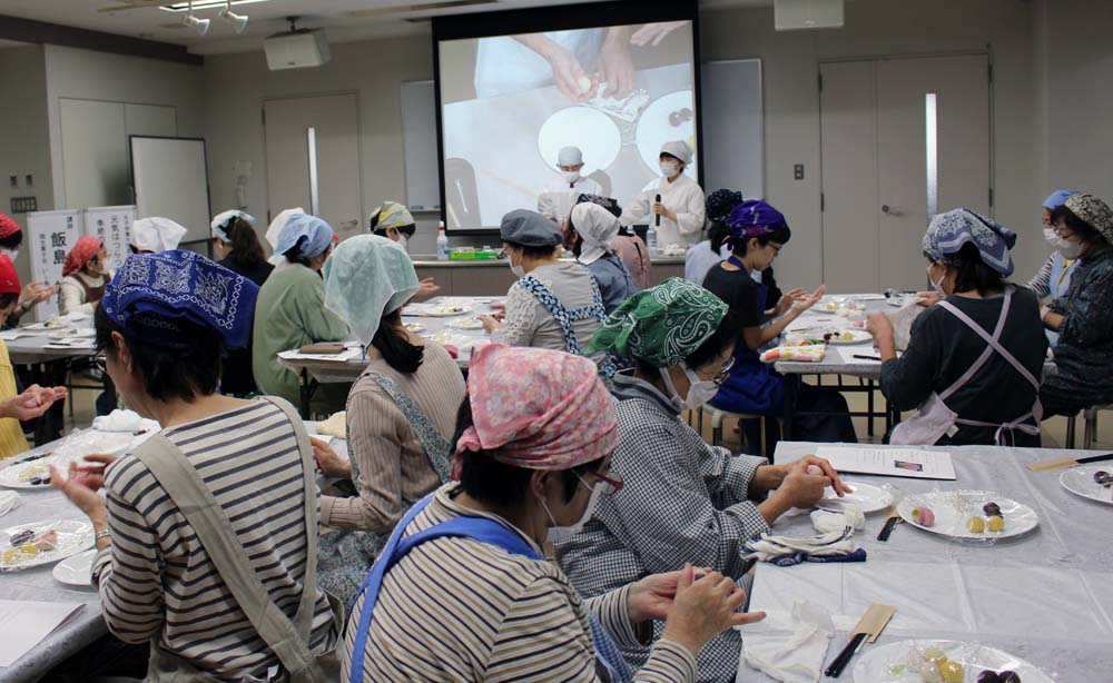 講座では、「あんが乾く前に仕上げる」「乾燥防止のため水飴を加える」「つなぎに白玉粉を使うため、手や作業台を濡らしながら作業する」「濡れ布巾は固く絞らない」など、実践的なコツも次々と紹介されました。