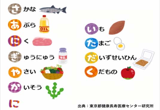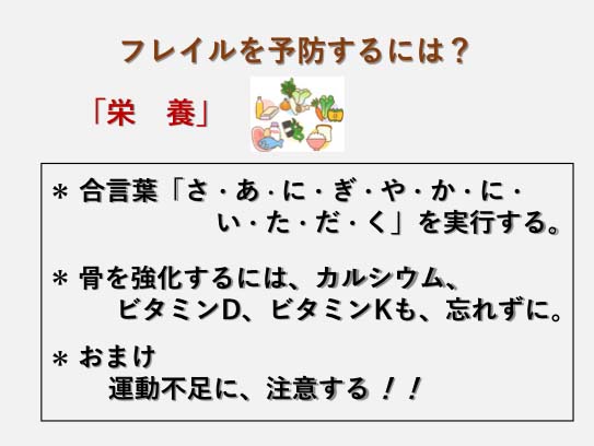 そしてフレイル予防のためには食事のとり方、食事のバランスが大切であることをわかりやすく講義してくださいました。食事のバランスをとるために、「1つ目の器:主食(ごはん、パン、めん類」、「2つ目の器:主菜(肉、魚、卵、大豆製品)」、「3つ目の器:副菜(野菜類、海藻、きのこ、こんにゃく)」の3つの器をそろえること。またフレイル予防のための栄養の摂り方を合言葉で紹介いただきました。
