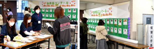 自分でつくった「my おべんとう」を撮影して応募する形の短大生全員参加イベントです。応募134点から選出された30点を企画担当の1年生実行委員が掲示。来場した学生が受付(写真左)で受け取ったシールを、写真右で選んだ作品に貼って投票しました。2日間の駒込祭終了間際、シールの数が多かった上位3点が下の写真です。なお最終結果は現在、短期大学部教務学生課の掲示板で発表されています。