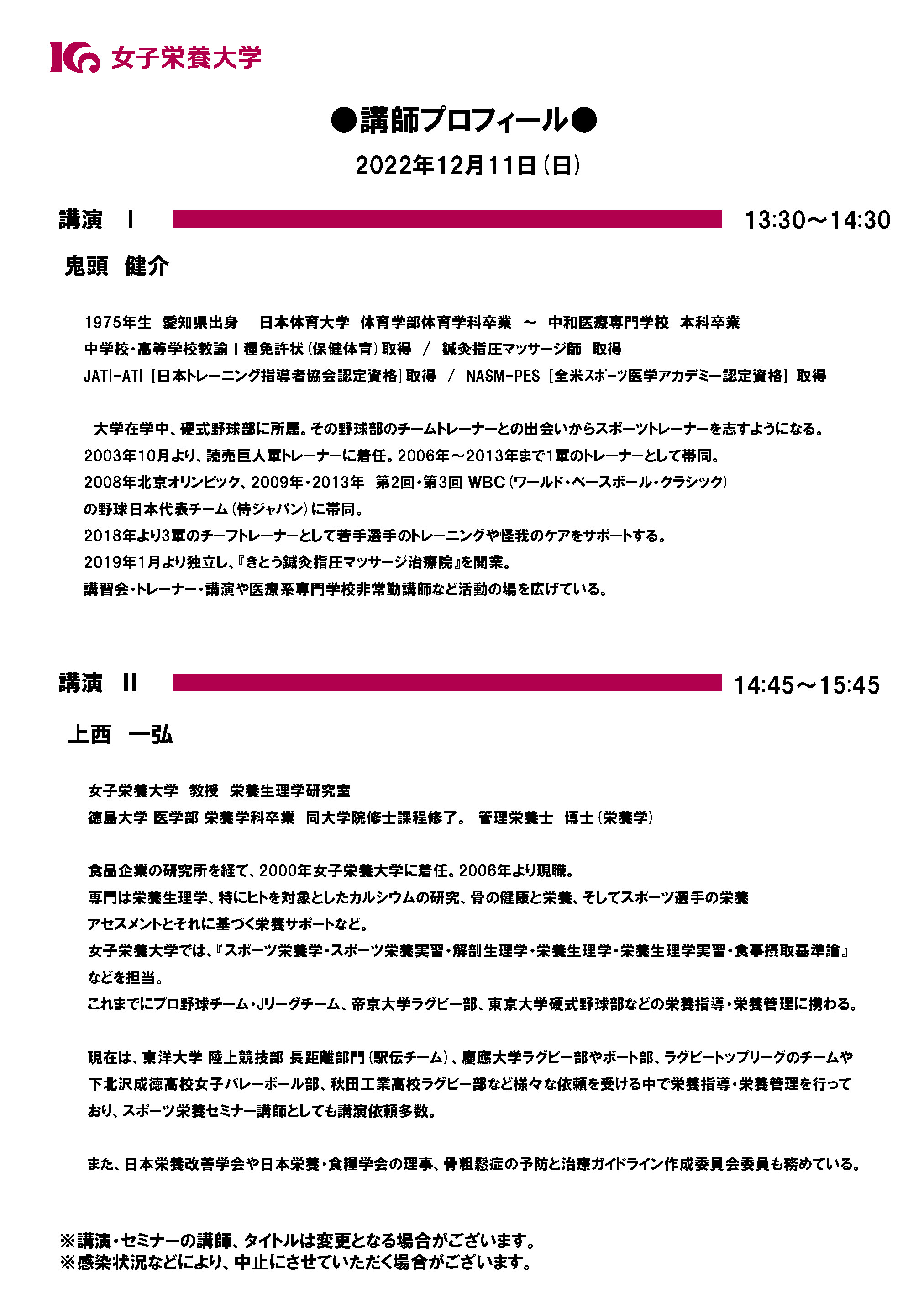 本セミナーは、特別講演及び本学教員の講演により、スポーツに携わる高校生が心身ともに健康で、長期に渡って身体をつくり、競技力を高め、ベストコンデイションで日々の練習や試合に臨めるよう、食事(栄養学)の大切さを理解していただくとともに、実際の場面で発揮できる力を身につけていただくことを目的とし実施するものです。