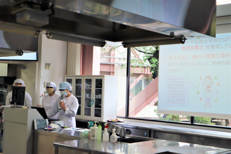 最初に、調理学研究室の豊満美峰子教授から、本学が「調理ができる栄養士・管理栄養士」を養成していることの理由について説明があり、入学後の1・2年次に学ぶ調理実習の授業について、実際のメニューの写真を使って紹介しました。