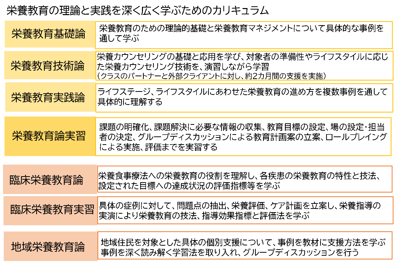 さらに、疾患を有する場合の栄養教育について疾患ごとの特性や技法を学ぶ「臨床栄養教育論」、疾患別の具体の症例に対し問題点の抽出から栄養教育の技法、その効果指標や評価方法までを学ぶ「臨床栄養教育論実習」、地域住民を対象とした個別栄養教育について実際のテーマを想定して具体の事例をもとに支援方法を学ぶ「地域栄養教育論」を設けています。