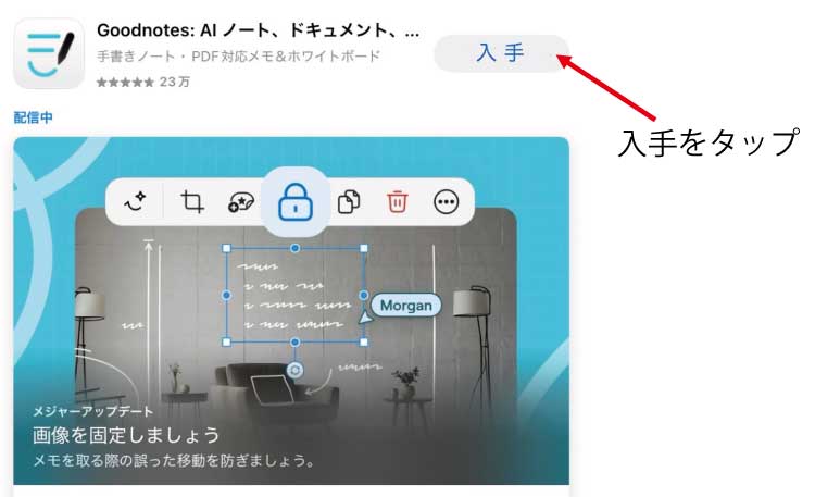 ④Goodnotesアプリが現れるので、入手をタップ