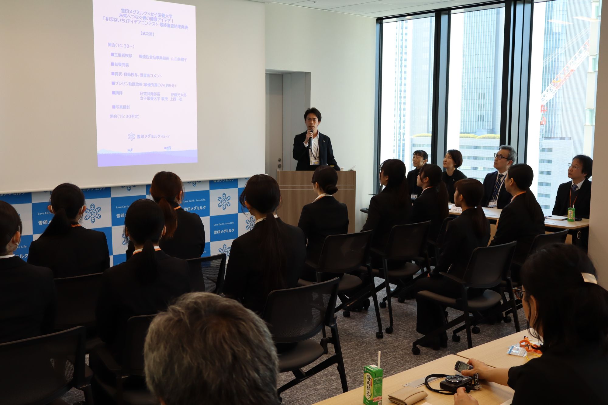 表彰式当日は、雪印メグミルク株式会社の研究開発部長から講評が行われ、生活者視点に立った発想力や、栄養学の知識を生かした具体性の高い提案に対して、高い評価が寄せられました。受賞した学生たちは、企業の第一線で活躍する社員との意見交換を通じて、実社会と学びとのつながりを実感する貴重な機会となりました。