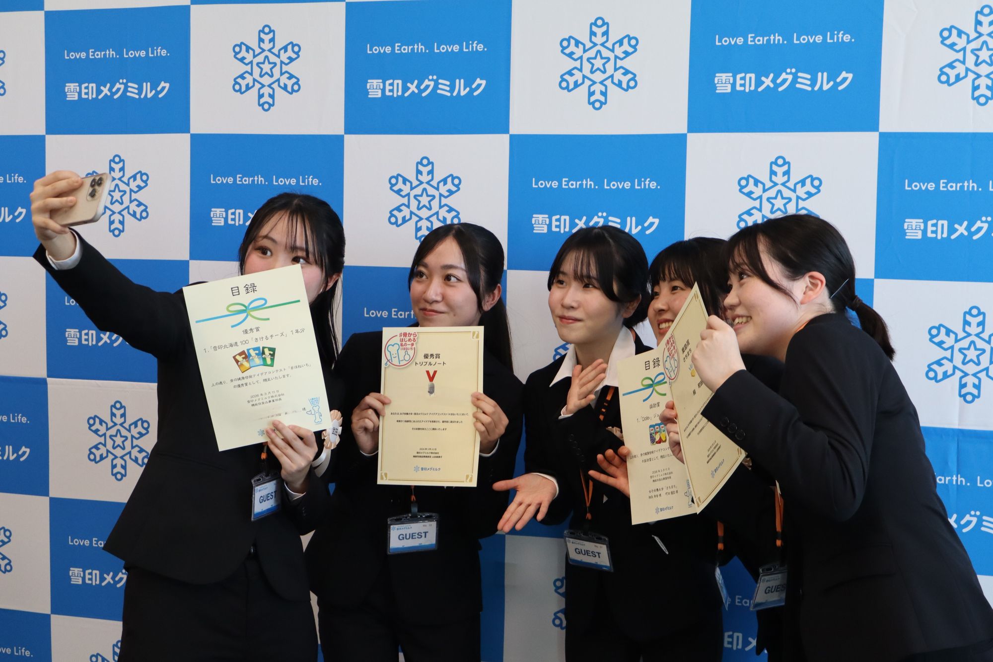雪印メグミルク株式会社と共同開催で実施した、栄養学部の学年・学科横断型の骨の健康啓発アイデアコンテストの表彰式が、3月11日(水)、雪印メグミルク株式会社本社にて執り行われました。