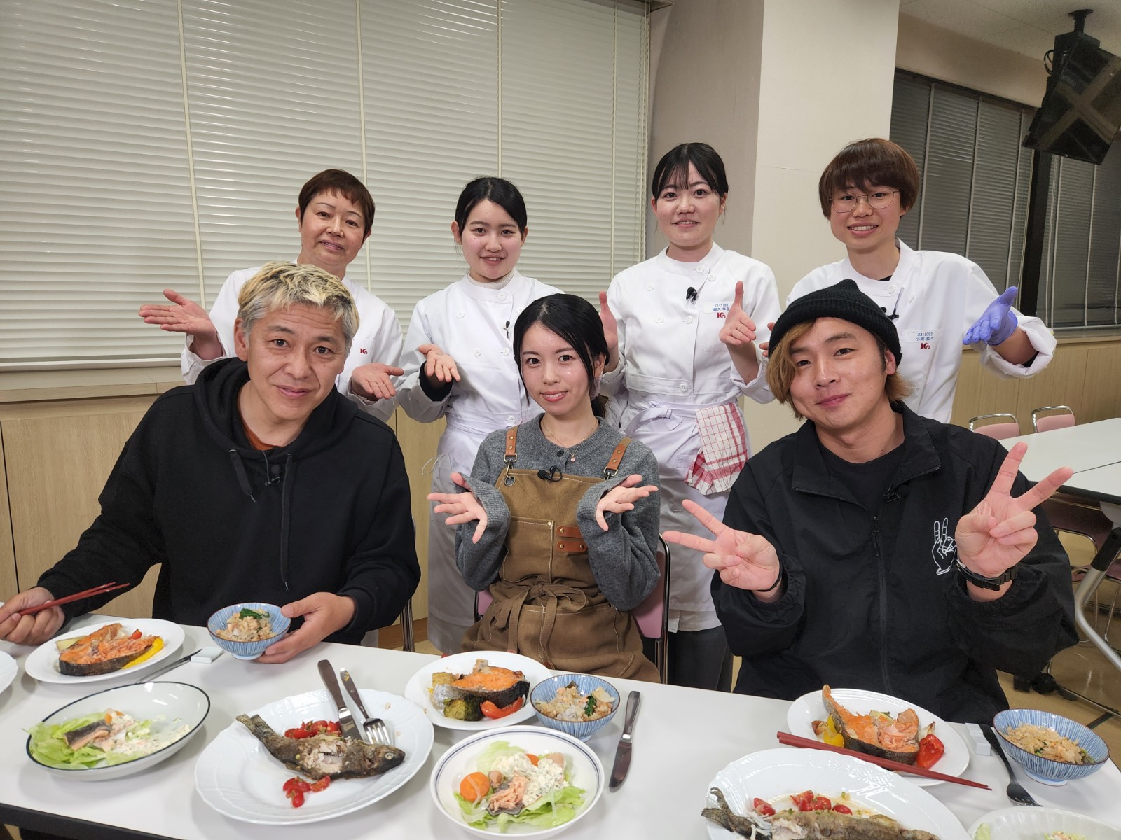 番組の後編では、坂戸キャンパスの調理実習室にて学生が釣った魚を調理している様子、出演者のみなさんに召し上がっていただいている様子が放映されました。
