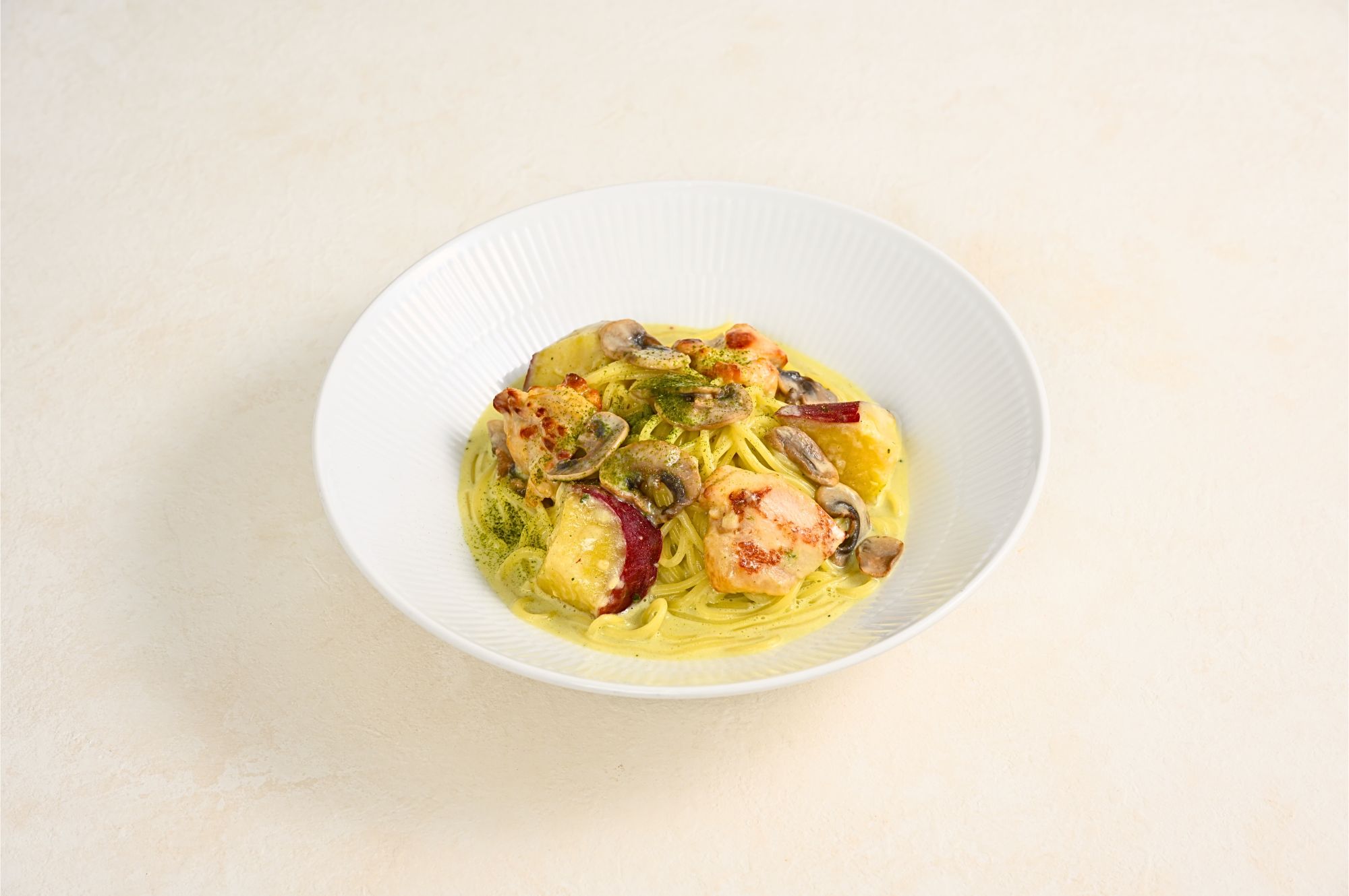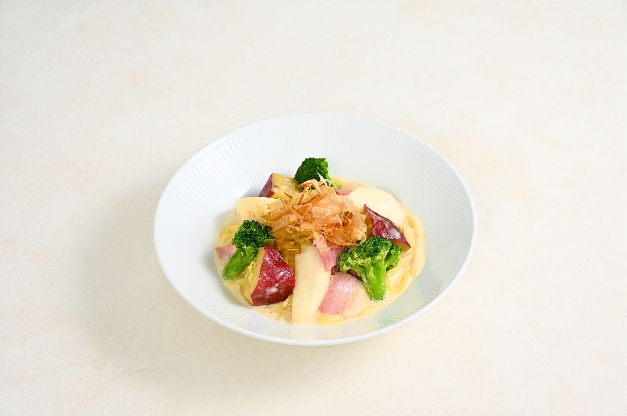 大きめにカットした川越市「飯野農園」のかぶを使用、さつまいも、ブロッコリー、ベーコンを贅沢にちりばめた、おだしの味わいを楽しめるクリーミーなパスタです!和のお出汁とかつお節のうま味に、洋のクリームが合わさった甘くて優しい味で、ほっこりした気持ちになれます!