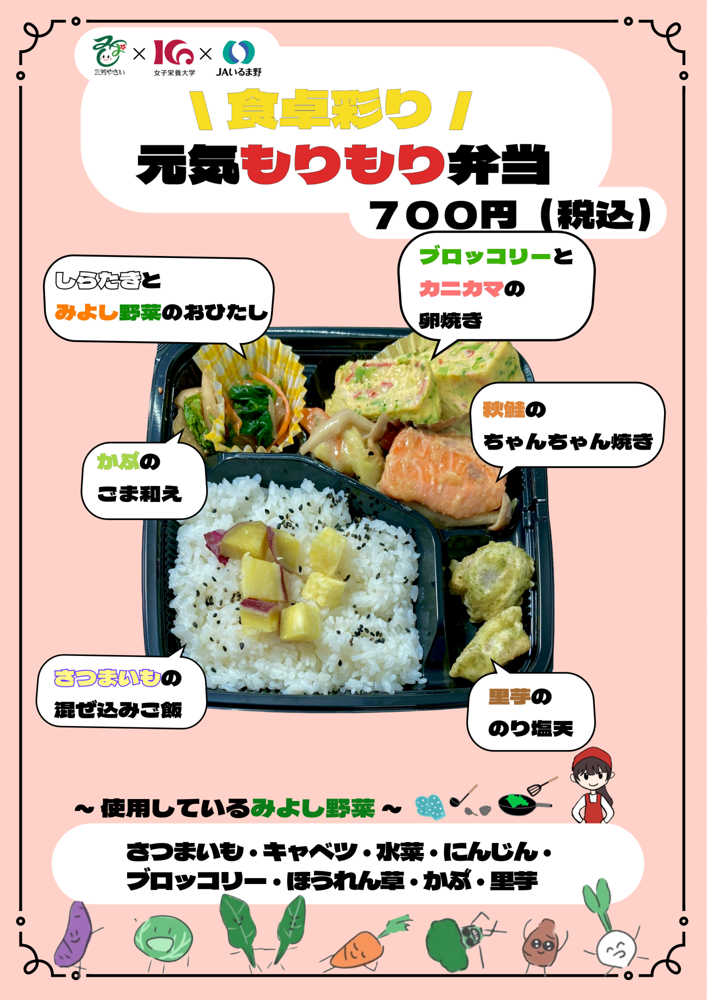 販売期間:11月17日(月)〜24日(月)みよし野菜で旅をしよう弁当(※11/19は店休日) / 11月25日(火)〜12月1日(月)・・・元気もりもり弁当