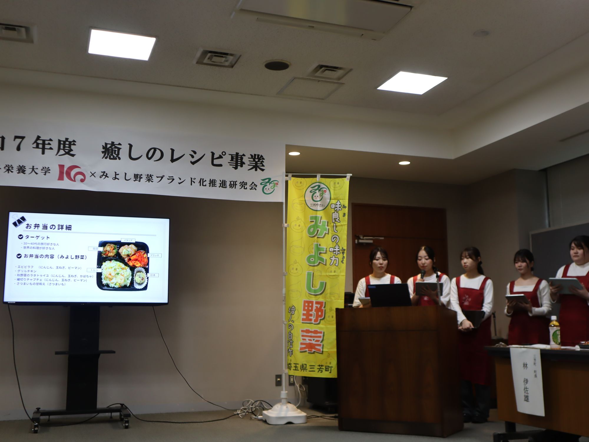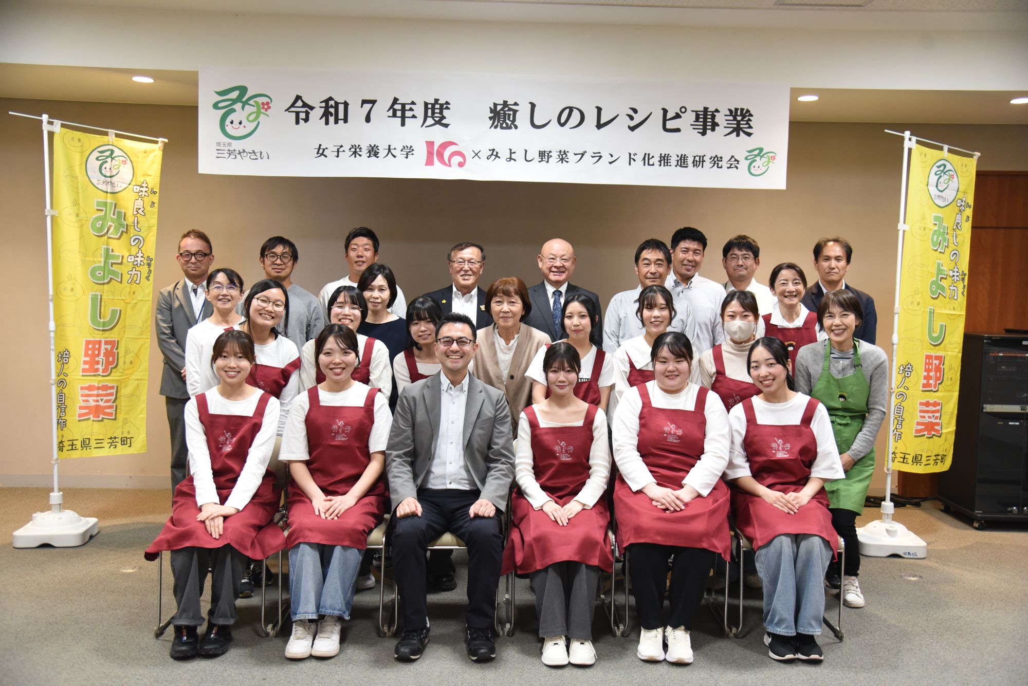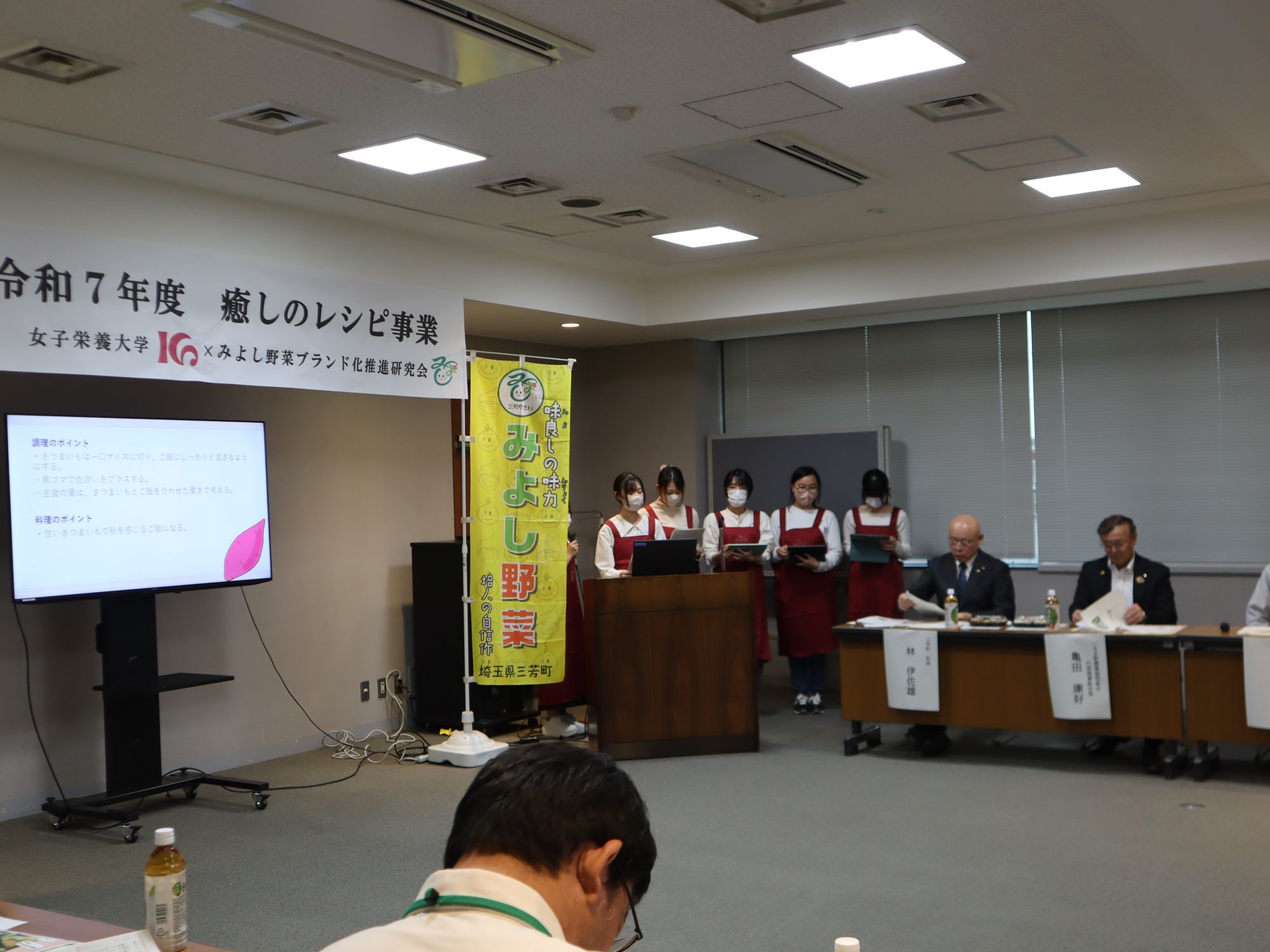 本学と包括連携協定を締結している埼玉県三芳町との取り組みで、食文化栄養学科 平口嘉典准教授のゼミ生と「みよし野菜ブランド化推進研究会」が「みよし野菜(※)」を使った「みよし野菜癒しのレシピ」を開発しています。