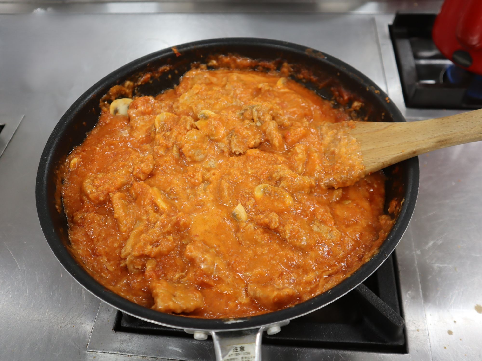 今回の実習では、ネクストミーツ社の公式レシピにはない「煮込む料理」を題材に実習を行いました。選ばれたメニューは、ロシアの家庭料理として知られる「ビーフストロガノフ」のビーフを代替肉に置き換えて調理しました。味付けされていないNEXTビーフの素材や栄養素の特徴を学びつつ、調理法を工夫する力を身につけました。